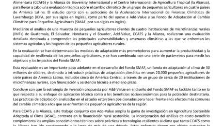 Diciembre 2019. Con el apoyo financiero del ICFA Luxemburgo, Add-Value y el Centro Internacional de Agricultura Tropical (CIAT), unieron esfuerzos para realizar un estudio denominado «Evaluación Técnica de Adaptación Climática y Validación de Mercado de un grupo de IMFs y sus Pequeños Agricultores Clientes en los siguientes países: Guatemala, El Salvador, Honduras y Ecuador. El trabajo de campo se llevará a cabo en los meses de enero y febrero de 2020, e incluirá visitas a cuatro IMF rurales activas en préstamos agropecuarios y un estimado de 48 de sus clientes con características de pequeños agricultores. El estudio se completará en mayo de 2020 y será crucial para construir el apoyo de SMAF a las IMF participantes y diseñar el alcance de la facilidad de asistencia técnica de SMAF.